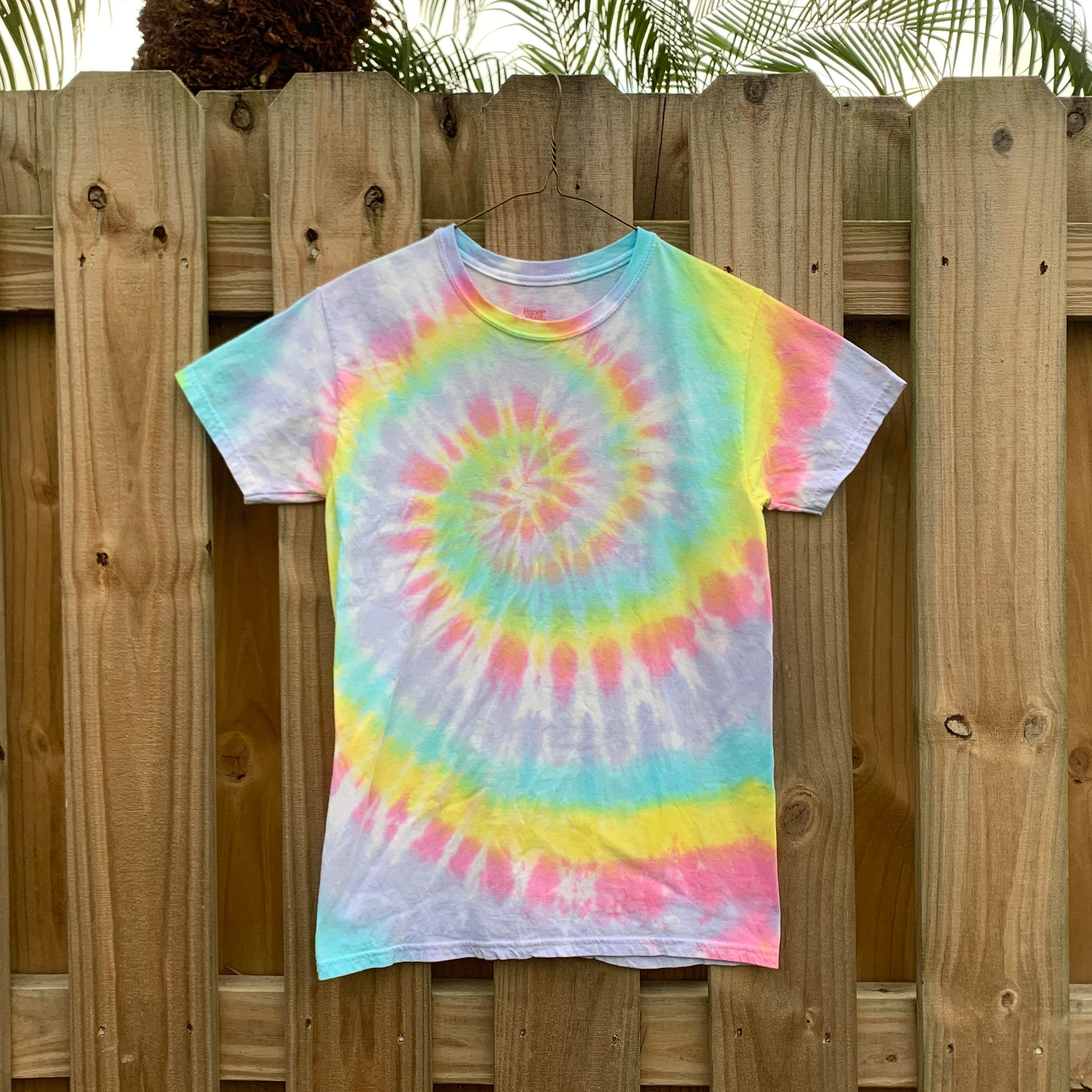 This listing is for a youth size (unisex) rainbow pastel tie-dye tee with a swirl design. There is also a listing for this tee in adult sizes as well as in long sleeve for adults and kids. Please note each shirt is made to order and no two tops will be exactly the same, hence the beauty and uniqueness of tie-dye!