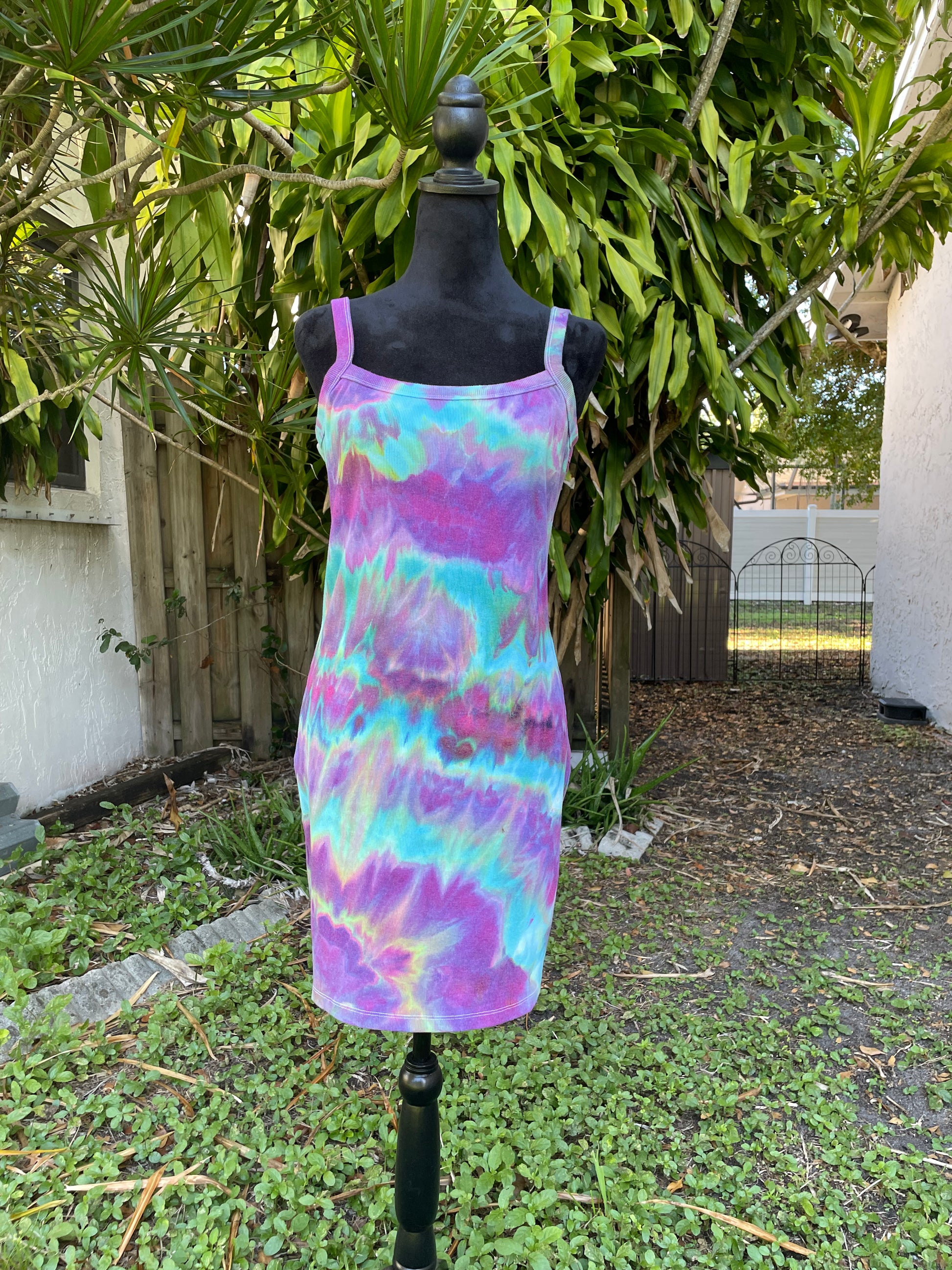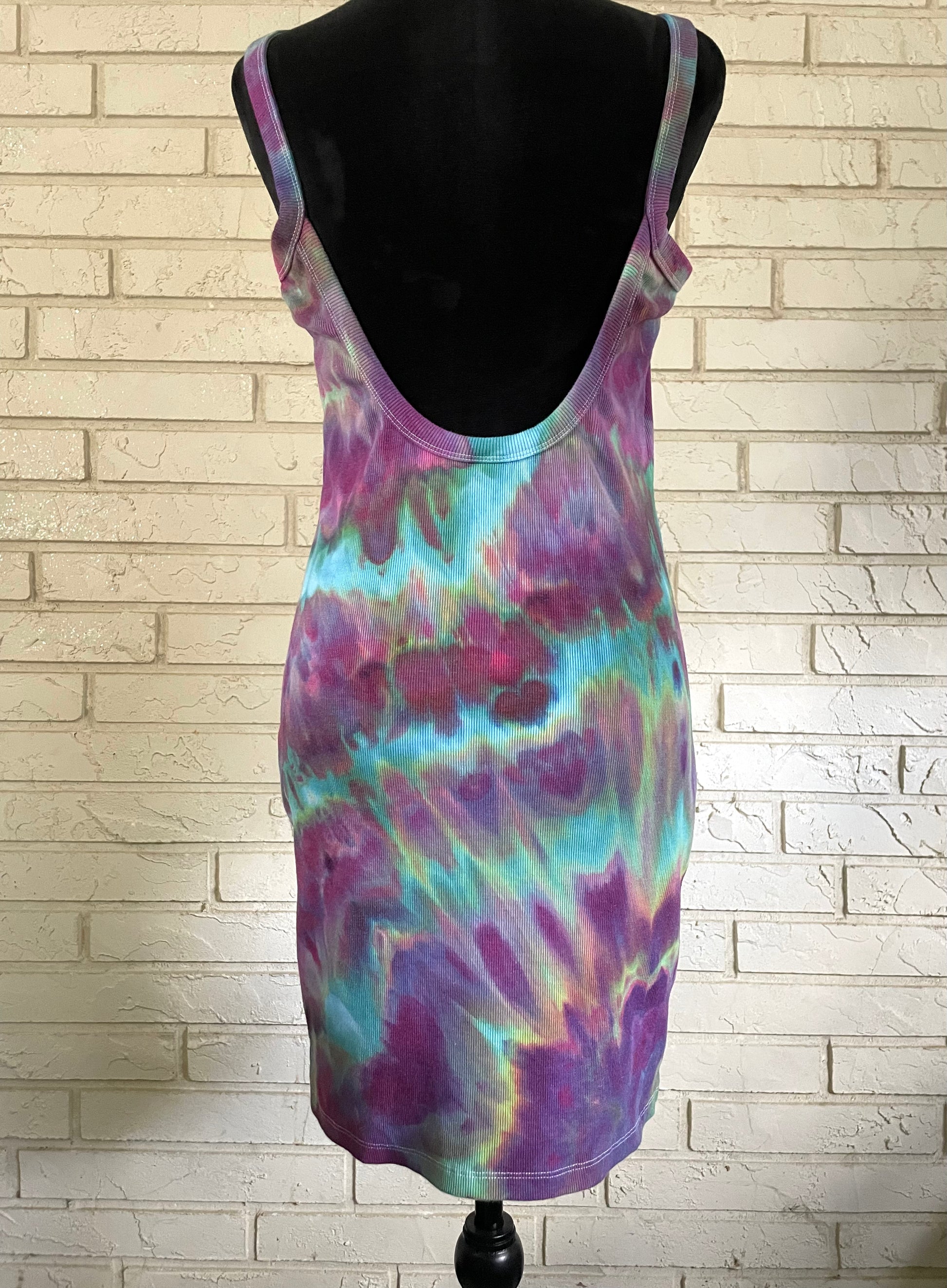 This listing is for one hand dyed ribbed bodycon dress. The size is Large. The dress features an open, low back. It is a tank style and is 57% cotton and 38% recycled polyester. This dress was hand dyed using professional, non toxic procion dyes and was done with an ice dyeing process. There is only one available.
