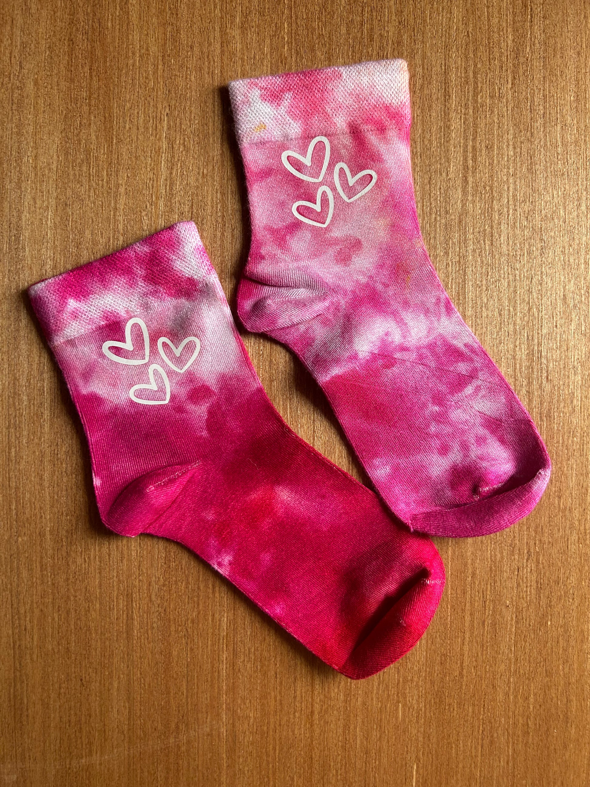 These socks are all hand dyed and the heart graphic is added after with a professional heat press. The graphic is on both sides of the socks.